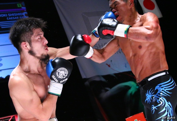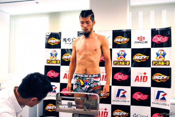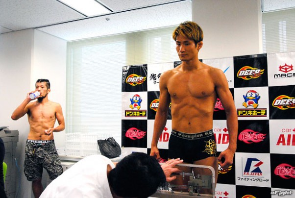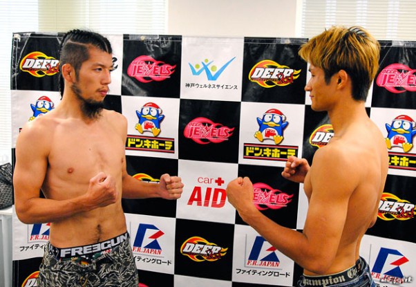 上迫(左)と石司(右)でDEEPフェザー級王座が争われる。石司は連続でタイトルマッチ