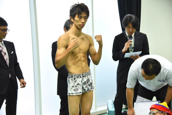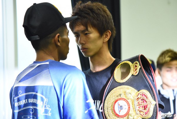 挑戦者ロベルト(左)に挑発され、睨み返す王者・田口