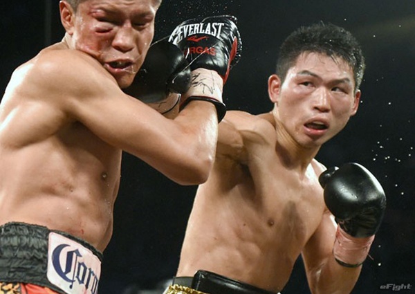 2015年、ラスベガスの防衛戦での三浦(右)。 王座陥落したものの、米スポーツ専門局ESPNなど複数のメディアが年間最高試合に選んだ。(写真:NAOKI FUKUDA/WOWOW)