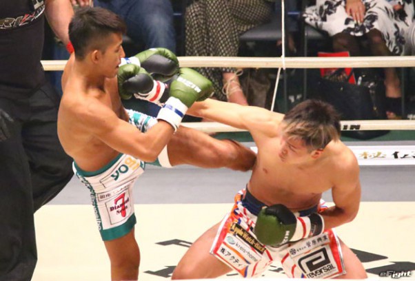 那須川天心(右)と真っ向から打ち合って散った才賀(左)