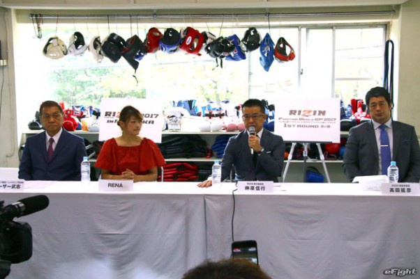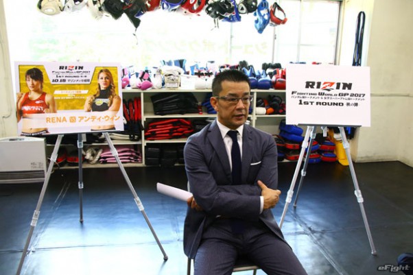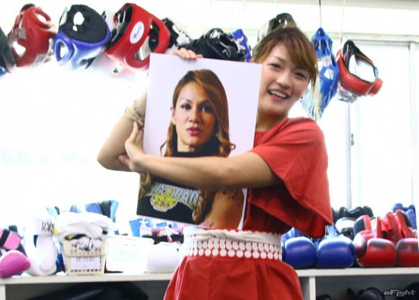 ウィンの写真パネルにチョークスリーパーを仕掛けるRENA