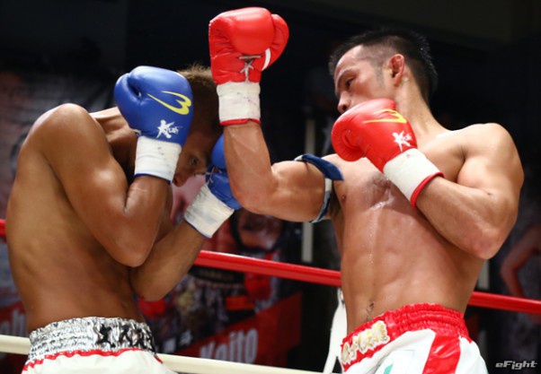 持ち前の打ち合うスタイルで大沢(左)を下した郷州(右)