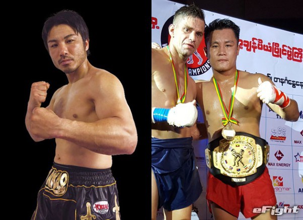 K-1 WORLD MAXに参戦した豪腕・晴矢(左)が、世界2連覇王者トゥエ(右写真の右の人物)に挑む