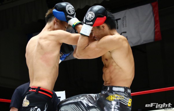 鈴木のガードの隙間からヒジを炸裂させた海人