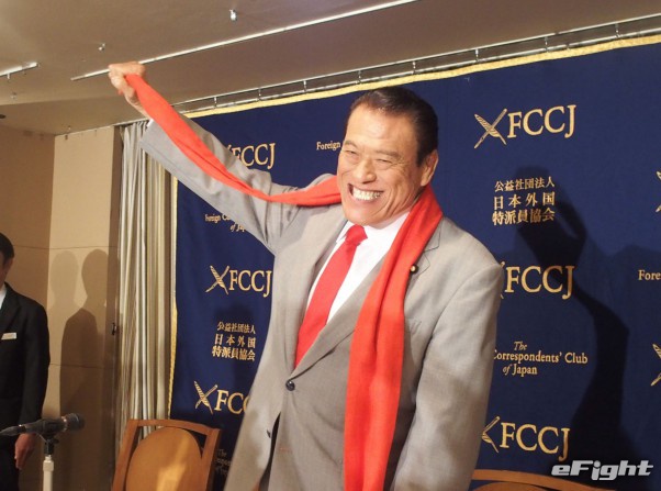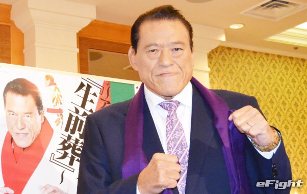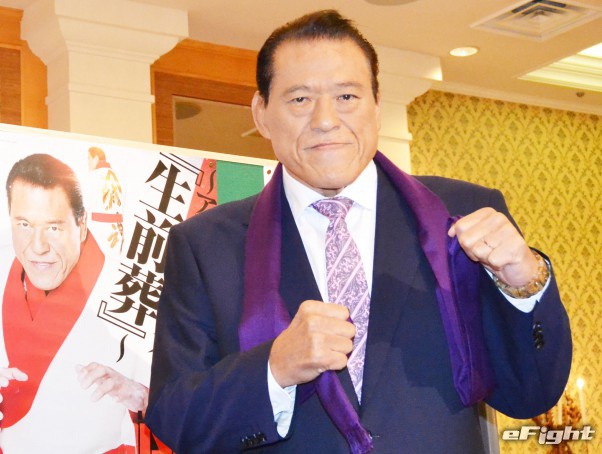 生前葬の会見に合わせ、普段の赤ではなく、紫色のストールの猪木氏
