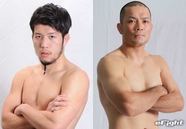 フェザー級王者・上迫(左)vs大ベテラン岩瀬(右)
