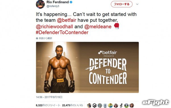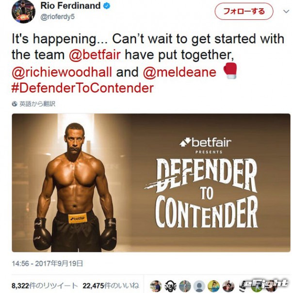 Rio FerdinandのTwitterにアップされた画像。「ディフェンダーからコンテンダーへ」と書かれている