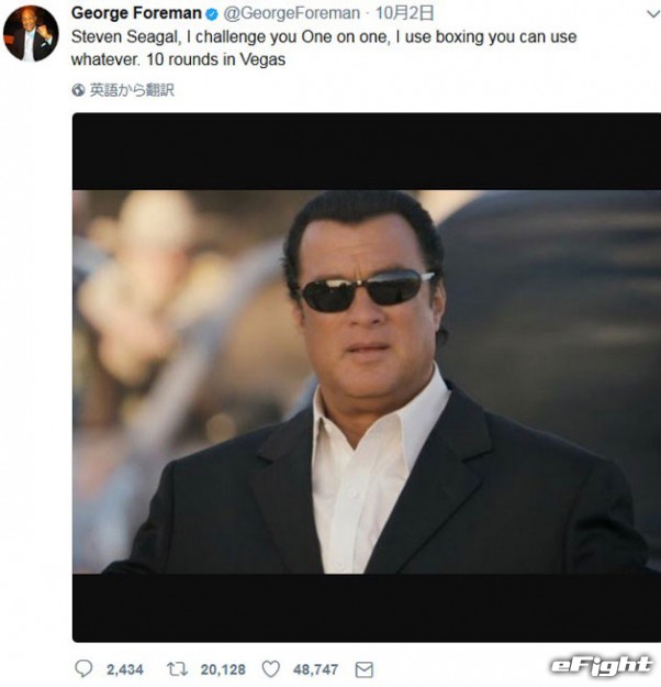 フォアマンが自身のTwitterで「スティーブン・セガール、俺はあんたに挑戦する。1対1で俺はボクシングを使う。あんたはどんな技を使ってもいい。ベガスで10Rだ」とツイート