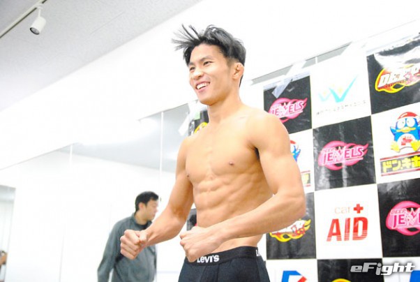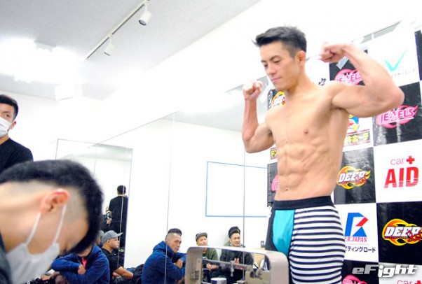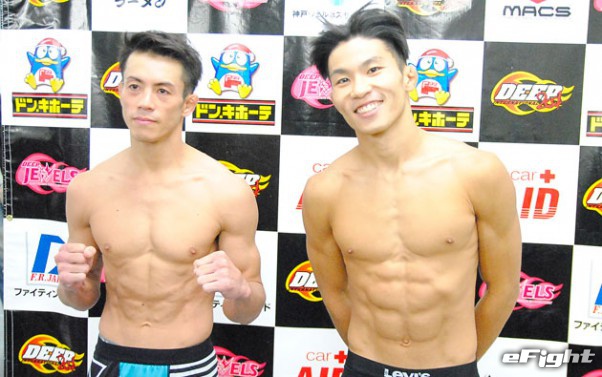 この試合に全てを懸ける決意の釜谷(左)。ジンス(右)は御覧の通り余裕の表情を見せた