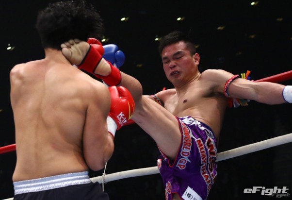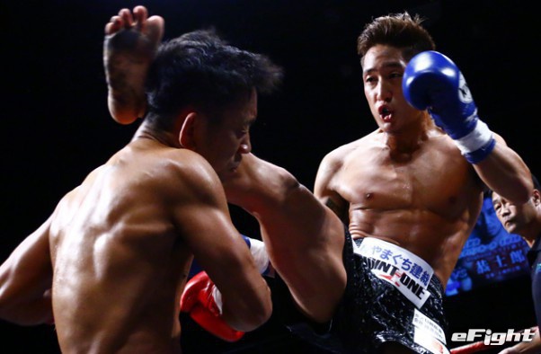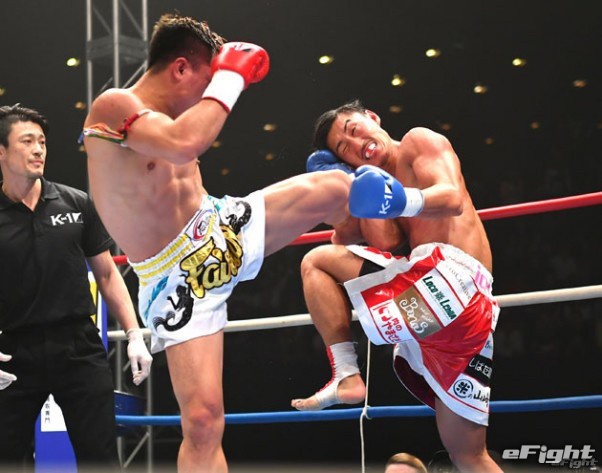 ゴンナパー(左)の強烈な左ミドルに身体ごともっていかれ、顔が苦痛に歪む山崎(右)
