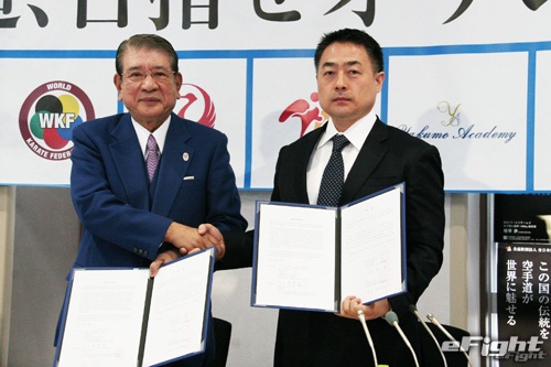 【フォト】2015年4月、全日本空手道連盟(笹川堯会長・左)と友好団体となった極真会館(松井館長・右)