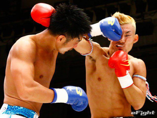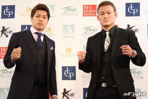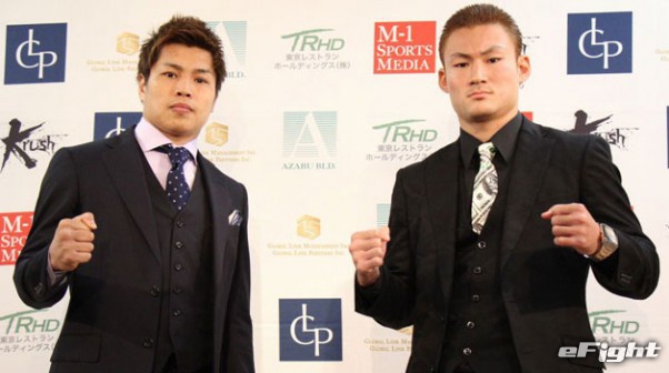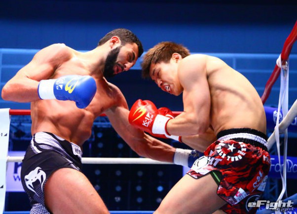 K-1スーパー・ウェルター級トーナメント1回戦で、優勝したアラゾフ(左)にKO負けを喫した中島