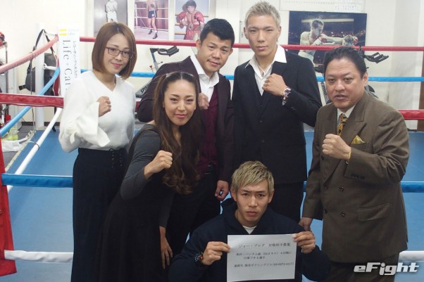 会見に出席した前列右から金平会長、ブログ、神田、後列右から京之助、興毅、矢吹