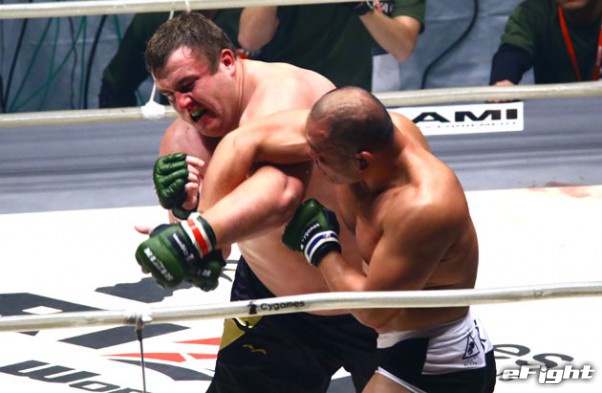 RIZIN旗揚げ戦の第1試合で、トンプソン(左)にTKO勝ちして復活