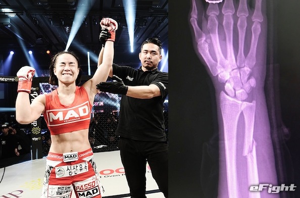 勝ち名乗りを受けるソヒだが、上に掲げられ左腕は骨折していた。右写真はソヒのレントゲン画像