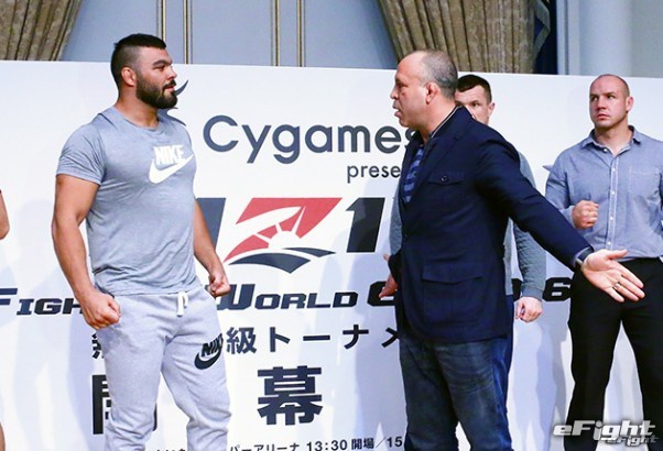 会見後のフォトセッションの際に、ヴァンダレイ・シウバ(左)に喧嘩を売るアリアックバリ(左)