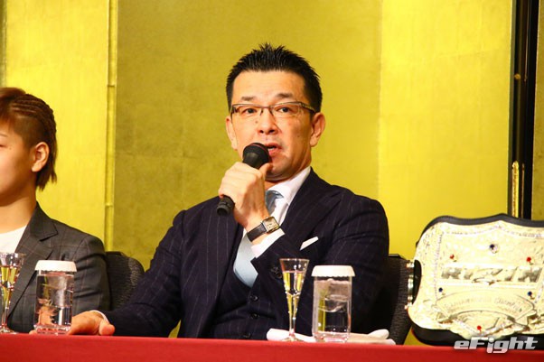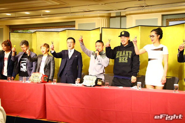 一夜明け会見は、バンタム級トーナメントで優勝した堀口恭司の音頭でファンと共に乾杯でスタート
