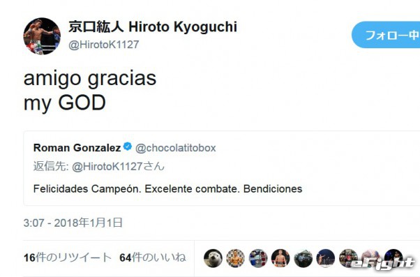 ロマゴンの祝福ツイートに、京口は感激の返信