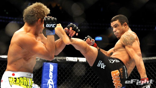 2015年のUFC JAPANで、ゲガール・ムサシにジャンピングバックスピンキック(飛び後ろ蹴り)を炸裂させ、番狂わせ勝利を飾ったホール(左)