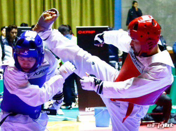 東京五輪出場を目指してテコンドーの大会に挑戦中の総合格闘家・菊野(右)