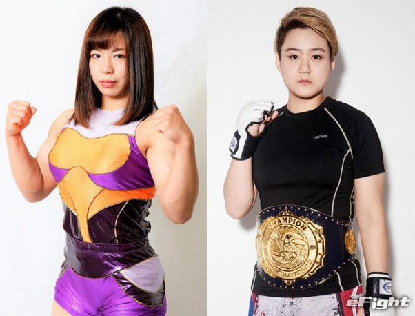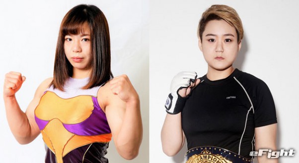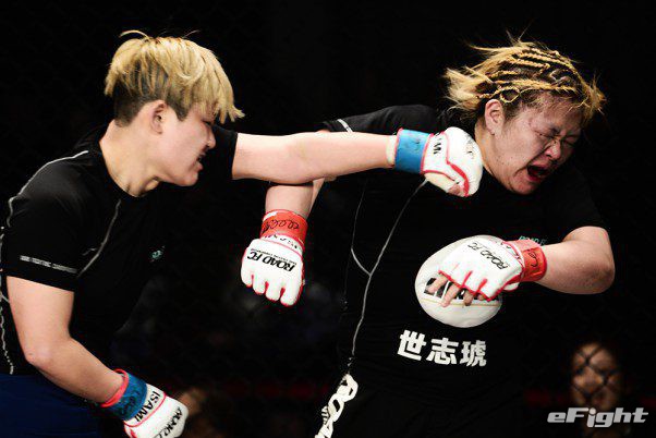 世志琥(右)に左ストレートを叩き込むキム(左)