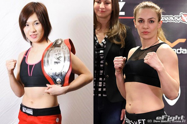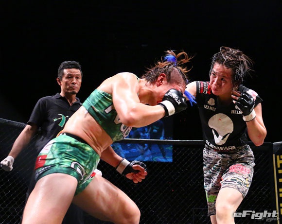 2015年8月にはベテラン・藤野恵実(左)の挑戦を退け、魅津希(右)はDEEP JEWELSストロー級王座の初防衛に成功している