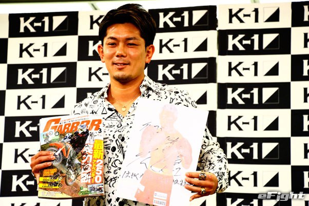 ヘルメットのカタログと、「早く風邪を治してね」など落書きをした卜部のパネルを持って撮影に応じる皇治