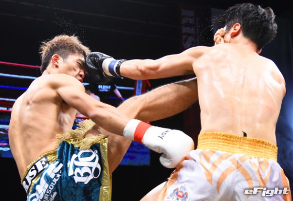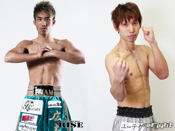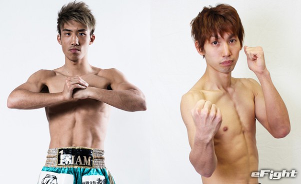 前RISEスーパーフェザー級王者・野辺広大(左)がJ-NETWORKスーパーフェザー級王者・鷲尾亮次(右)と対戦