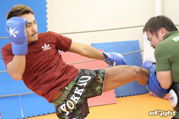 「得意な蹴り技がさらにレベルアップした」と王座奪取に自信を見せる村越(左)