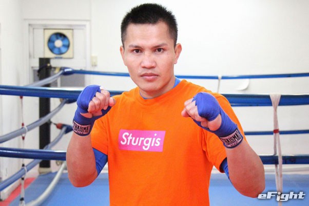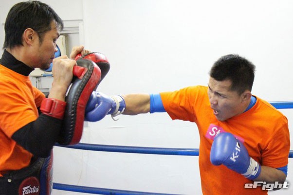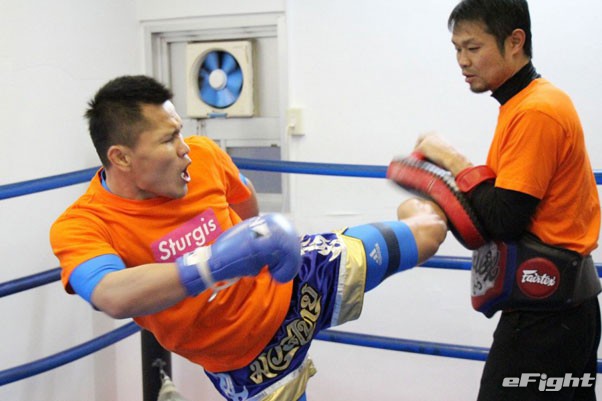 迫力と破壊力満点のミドルキックをミットに蹴り込むスアレック