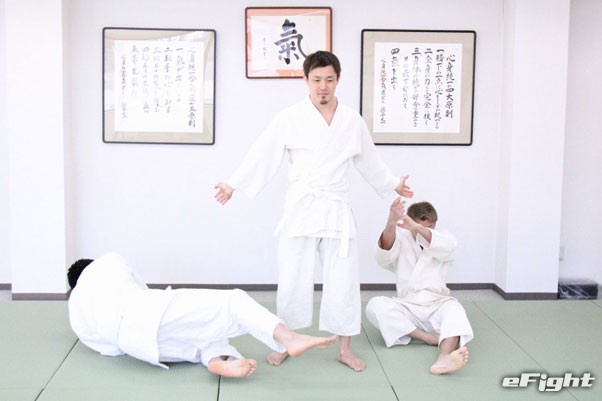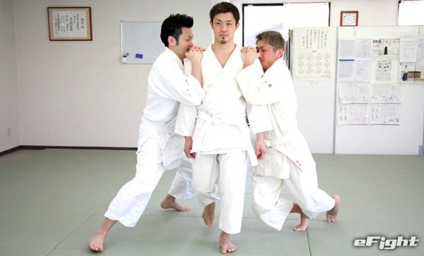 佐藤嘉洋(左)、泰斗(右)らを相手に合氣道の技を披露した大和(中央)