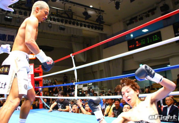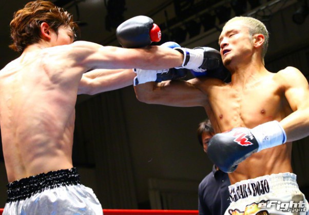 昨年4月、J-NET王者の鷲尾亮次から右フックで逆転KOした島野(左)