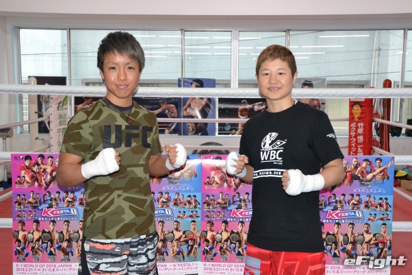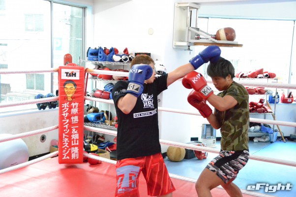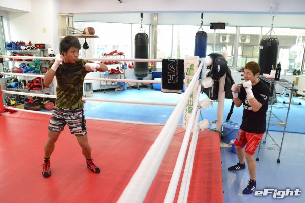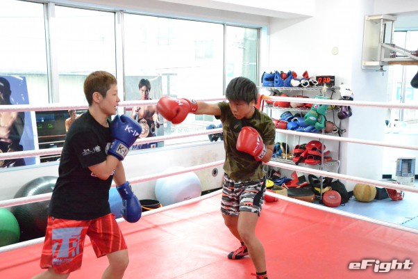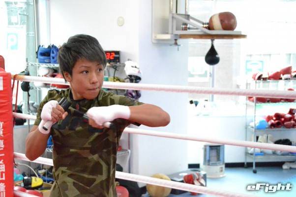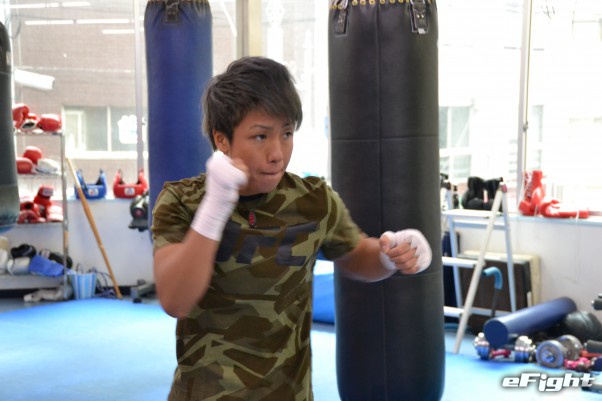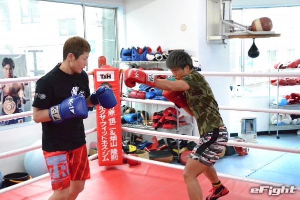 藤岡のアドバイスを受けながら特注ダンベルでフックを打つKANA。