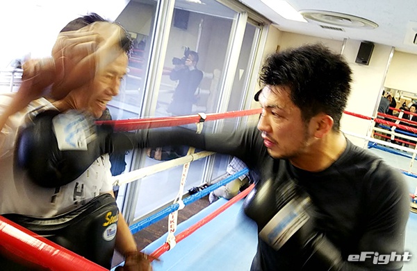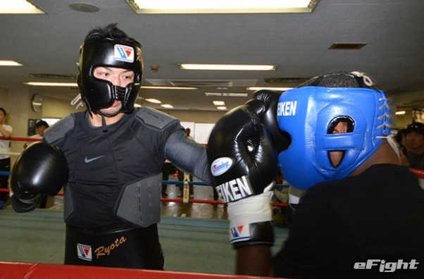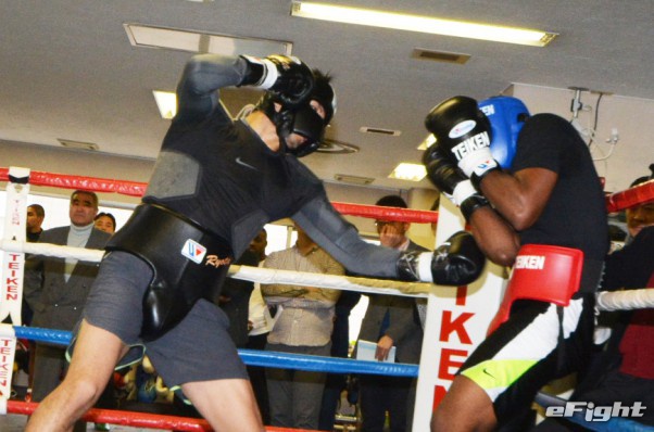 スパーリングで米国のプロボクサーをコーナーに追い込み圧倒した村田諒太(左)