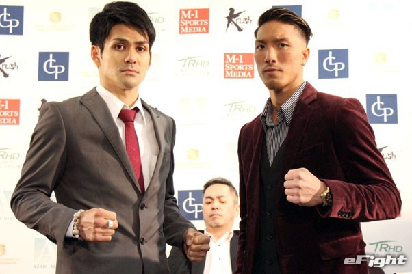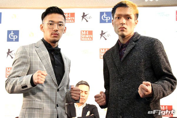 沖縄からKrushのベルトを獲るためにやってきた中村(左)とフィジカルモンスターFUMIYA(右)