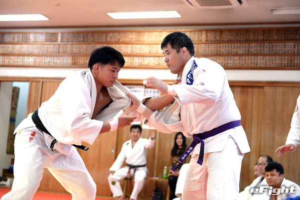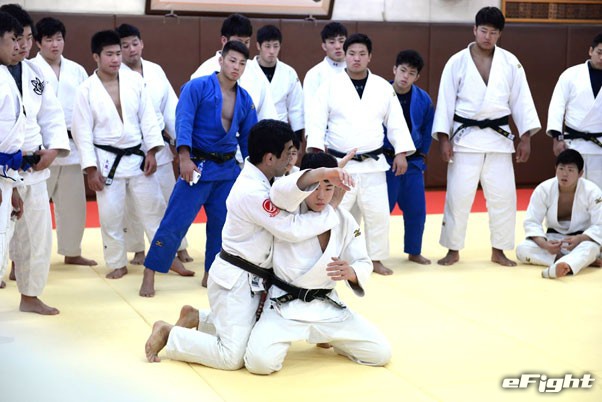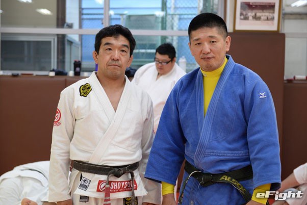 日大柔道部の金野潤監督(右)と日本ブラジリアン柔術連盟の中井祐樹会長(左)