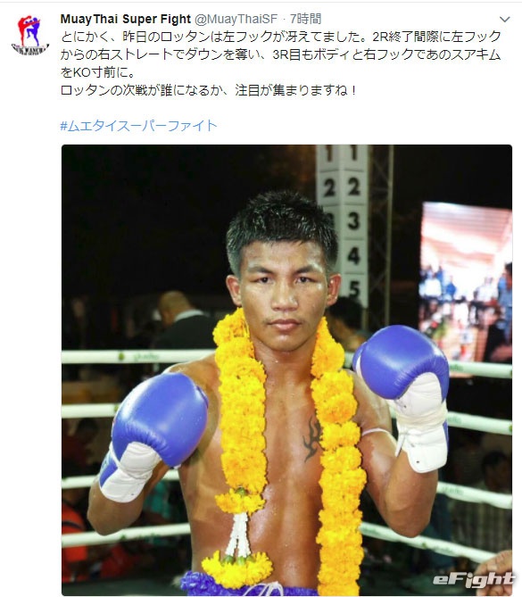 ロッタン(写真)の勝利を現地から速報したMuay Thai Super FightのSNSより