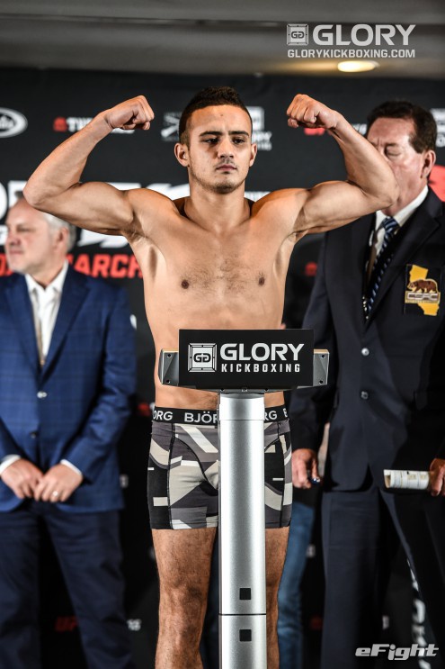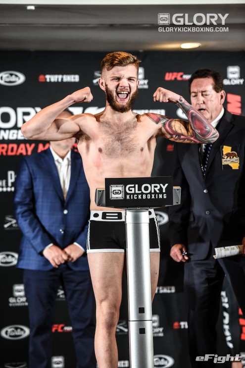 額をつけてにらみ合うザカリア(右)とサグデン(左)