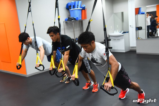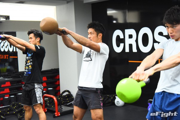 ケトルベルを使ったトレーニングを披露するT-98(中)