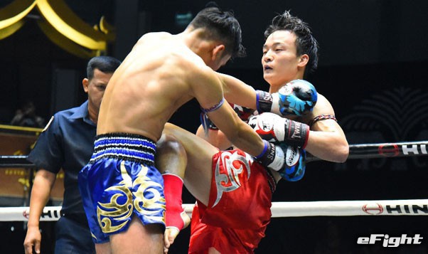 ルンピニーの試合でテンカオ(ヒザ蹴り)を使いKOに至らせる志朗