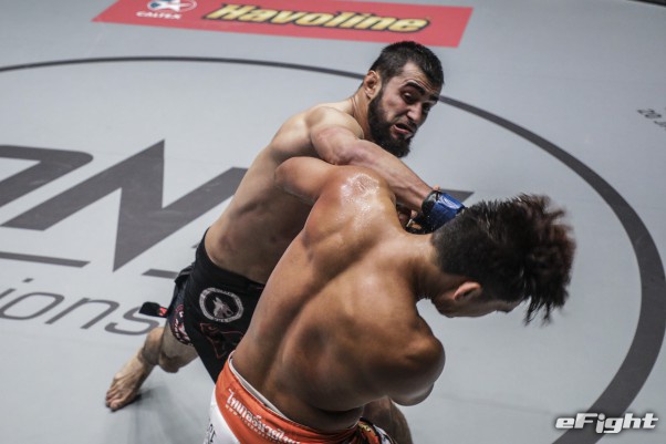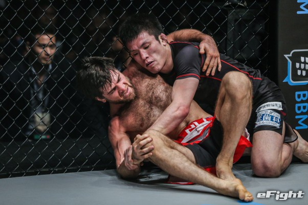 今年1月のグラップリングマッチで、青木は元ONEフェザー級王者マラット・ガフロフ(下)にリアネイキドチョークで一本勝ちした