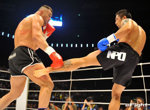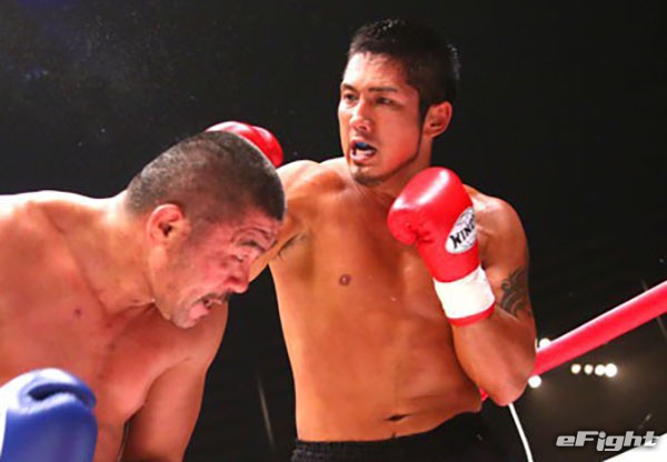 旧K-1で活躍した天田ヒロミ(左)にパンチを見舞うKOICHI(右)
