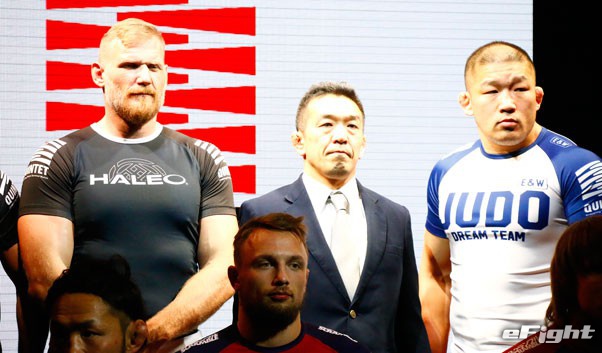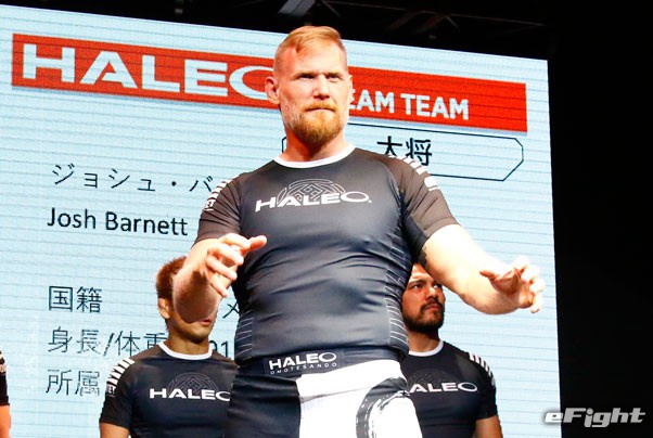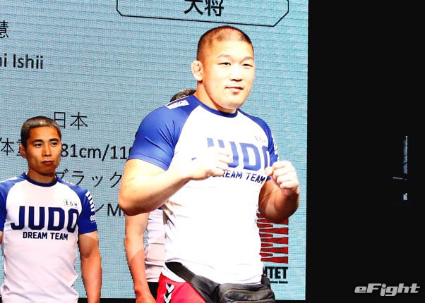 石井(右)との大将戦での対決を望んだジョシュ(左)。中央は中井祐樹・審判委員長