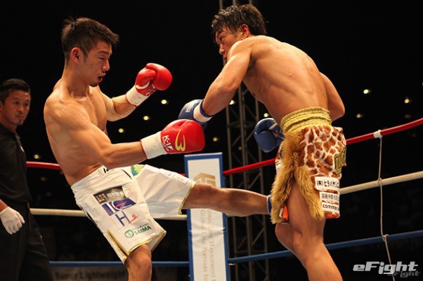 空手仕込みのローキックで相手の脚を破壊しにかかる伊澤(左)