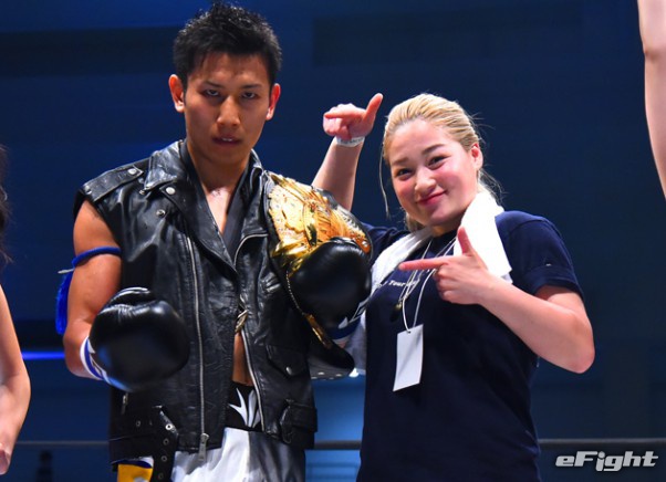 鬼嫁として知られる元WPMF世界女子フライ級王者いつか(右)が秀樹(左)を祝福
