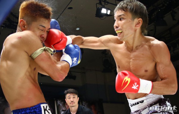 WKA&WBKF世界王者・谷山俊樹(左)に右ストレートをクリーンヒットさせる佐々木(右)