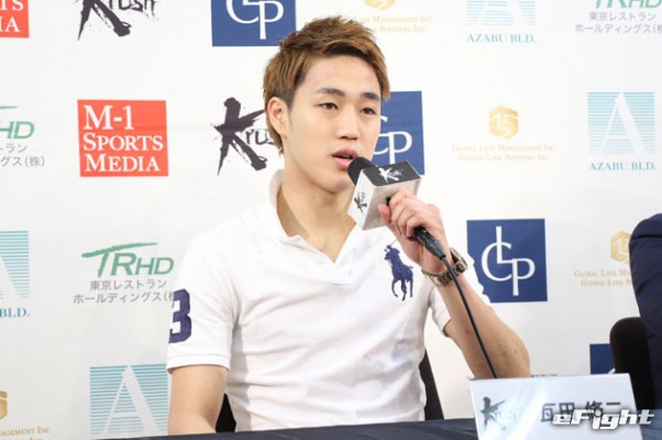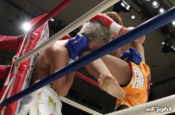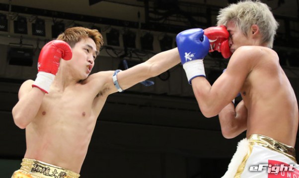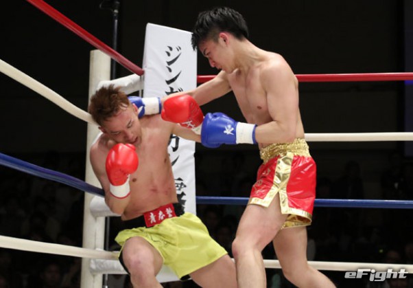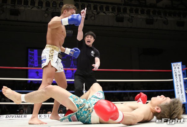 鈴木の強烈なフックをまともに喰らい、ぶっ倒れた川崎(下)
