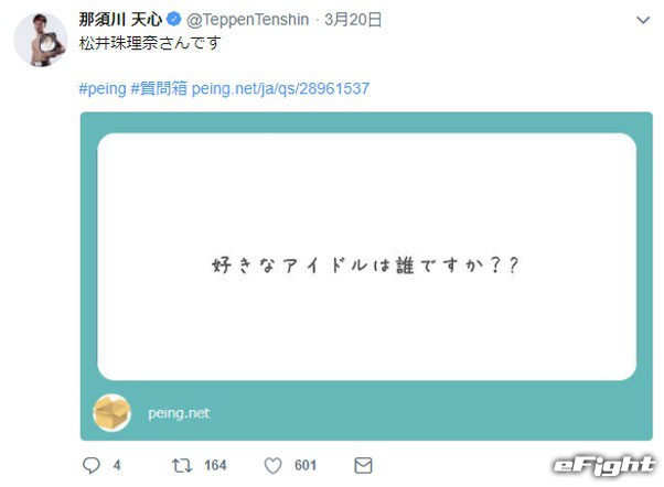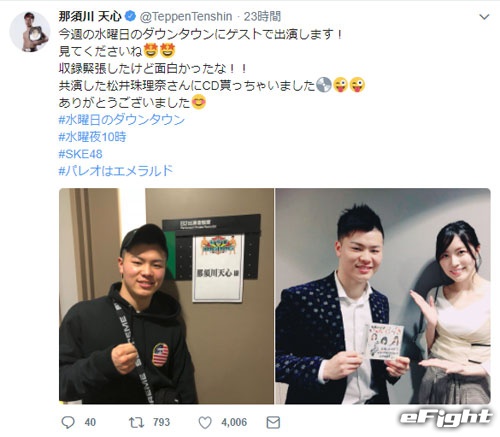 ファンからの「好きなアイドルは誰ですか?」との質問に「松井珠理奈さん」と答えている那須川