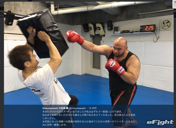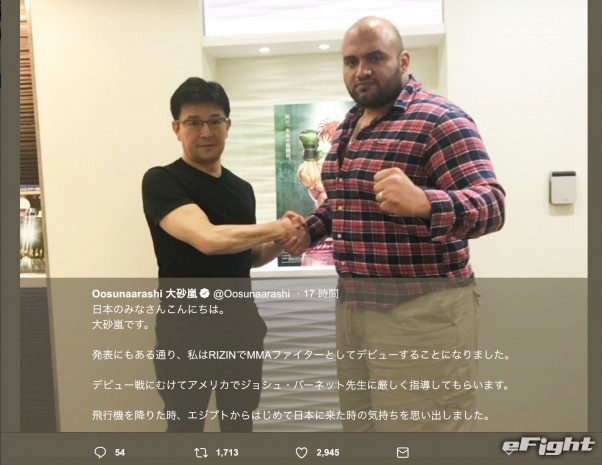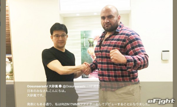 RIZINの榊原信行実行委員長と握手をする大砂嵐。後ろにはRIZINのポスター(大砂嵐ツイッターより)