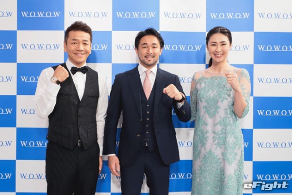 山中慎介(中央)がゴロフキンやリナレス戦の見所を語った。右は進行役のくりぃむしちゅー・上田晋也、左は元プロゴルファーの古閑美保